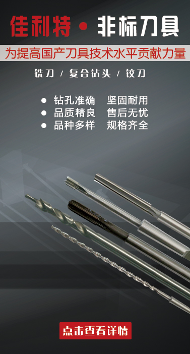 鎮(zhèn)江佳利特刀具有限公司是制造非標準特種刀具的企業(yè)。本公司主要生產(chǎn)高速鋼和硬質(zhì)合金特殊刀具。產(chǎn)品使用于機械、電子、汽車制造、塑膠、木制品等行業(yè)。公司生產(chǎn)的復合孔加工刀具、銑削刀具和成型銑刀等刀具。成為廣大用戶提高生產(chǎn)效能的途徑,深受用戶好評。公司作為制造非標特種刀具的企業(yè)我們將致力于刀具的國產(chǎn)化,為提高國產(chǎn)刀具技術水平貢獻力量。無論您需要何種刀具,我們將以合理的價格為您提供好的切削刀具和完善的技術服務。非標刀具式樣繁多,如無圖樣我們將竭力提供設計服務,并快速準確地交出滿意的刀具。[ 其它+ ]